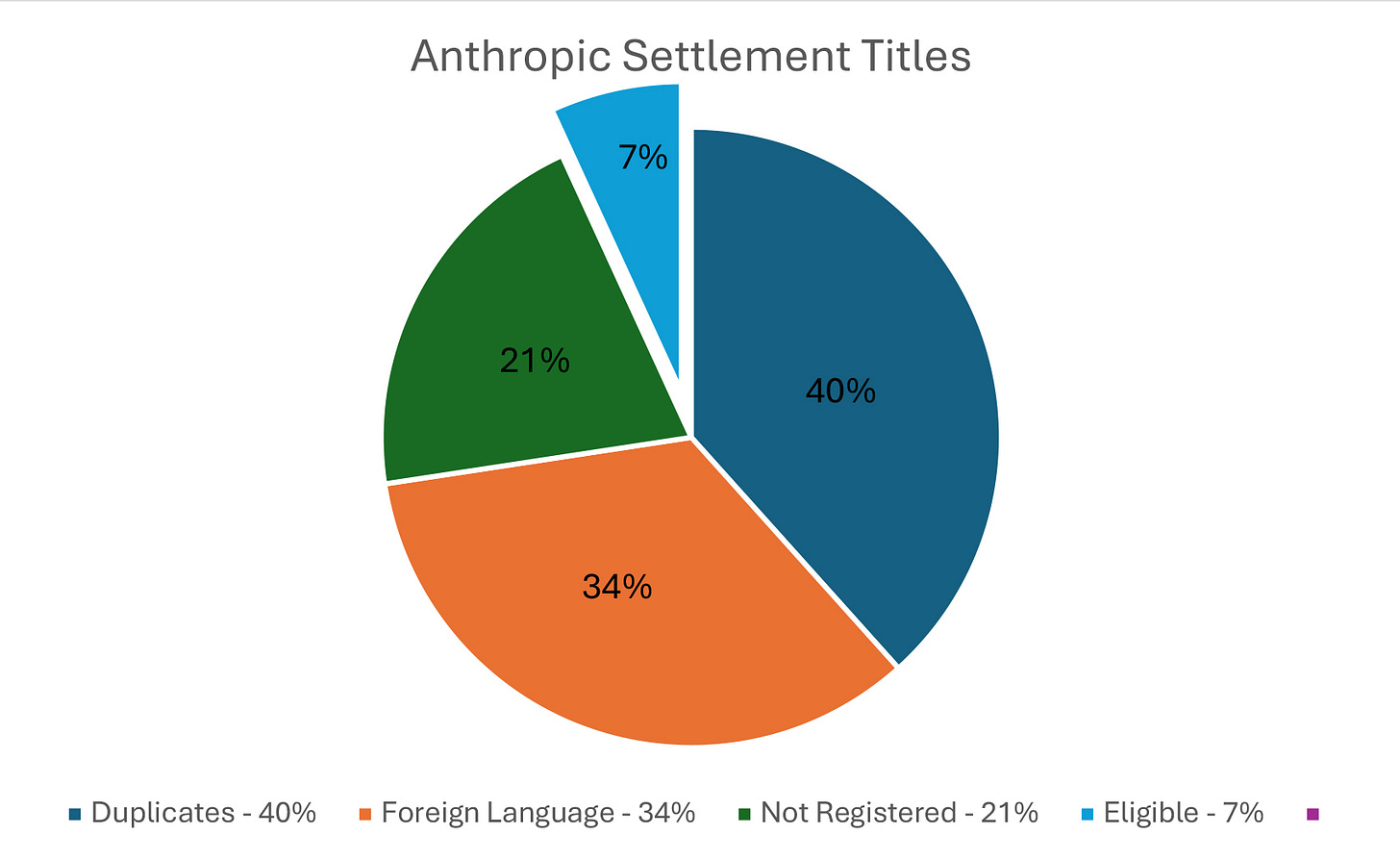 FAQ 52 explains that 40%, or 2.8 million were duplicates of the same title. They also eliminated corrupt, empty, or incomplete files. Another 2.5 million were written in another language and non-English titles rarely have titles registered. Another 1.5 million titles did not have copyright registered with the U.S. Copyright Office. That left only about 500,000 titles eligible in the lawsuit, or about 7% of the titles provided by Anthropic.